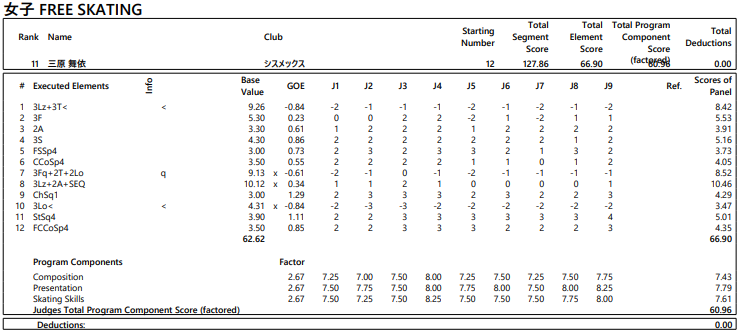 フィギュアスケートのミラノ・コルティナ冬季五輪代表最終選考会を兼ねる全日本選手権最終日は21日、東京・国立代々木競技場で行われ、女子で大会直前に今季限りでの引退を表明した26歳の三原舞依(シスメックス)はフリーは11位となり、合計190.63点でショートプログラム(SP)の13位から順位を上げ10位だった。