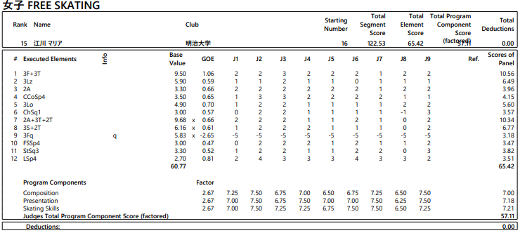 フィギュアスケートのミラノ・コルティナ冬季オリンピック代表最終選考会を兼ねる全日本選手権最終日は21日、東京・国立代々木競技場で行われ、女子でショートプログラム(SP)9位の江川マリア(明大)がフリーで15位となり、合計187.29点で13位だった。