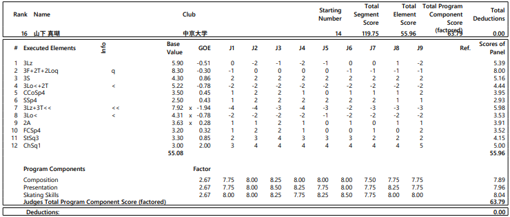 フィギュアスケートのミラノ・コルティナ冬季オリンピック代表最終選考会を兼ねる全日本選手権最終日は21日、東京・国立代々木競技場で行われ、女子でショートプログラム(SP)11位の山下真瑚(中京大)はフリーで16位となり、合計183.18点で15位だった。