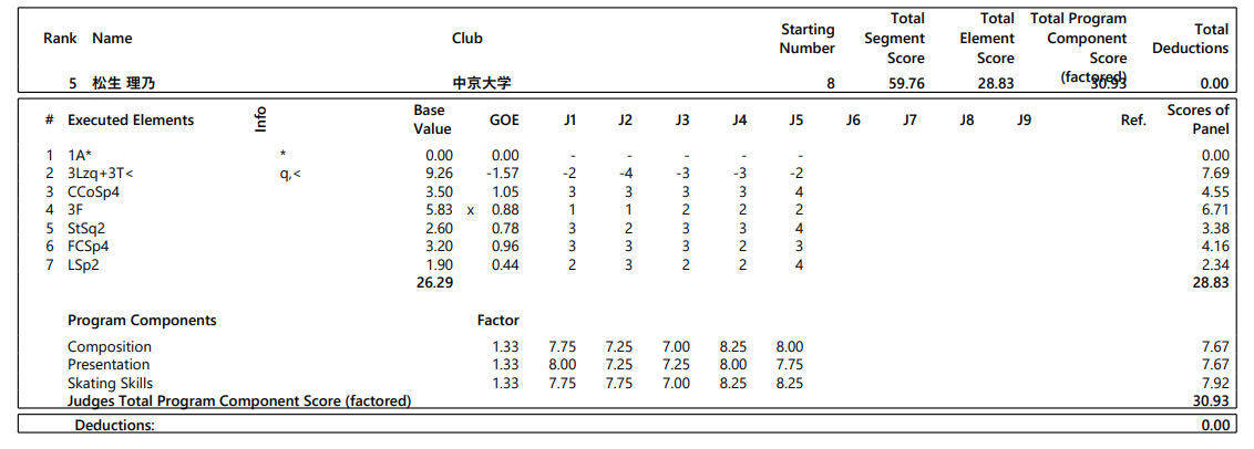 日本学生氷上競技選手権は10日、東京辰巳アイスアリーナでフィギュアスケート第1日が行われ、女子ショートプログラム(SP)で松生理乃(中京大)は59.76点で5位となった。