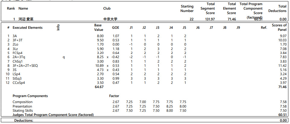 日本学生氷上競技選手権は11日、東京辰巳アイスアリーナでフィギュアスケート最終日が行われ、女子でショートプログラム(SP)3位の河辺愛菜(中京大)はトリプルアクセル(3回転半ジャンプ)を成功させたフリーでトップの合計194.40点で3位だった。