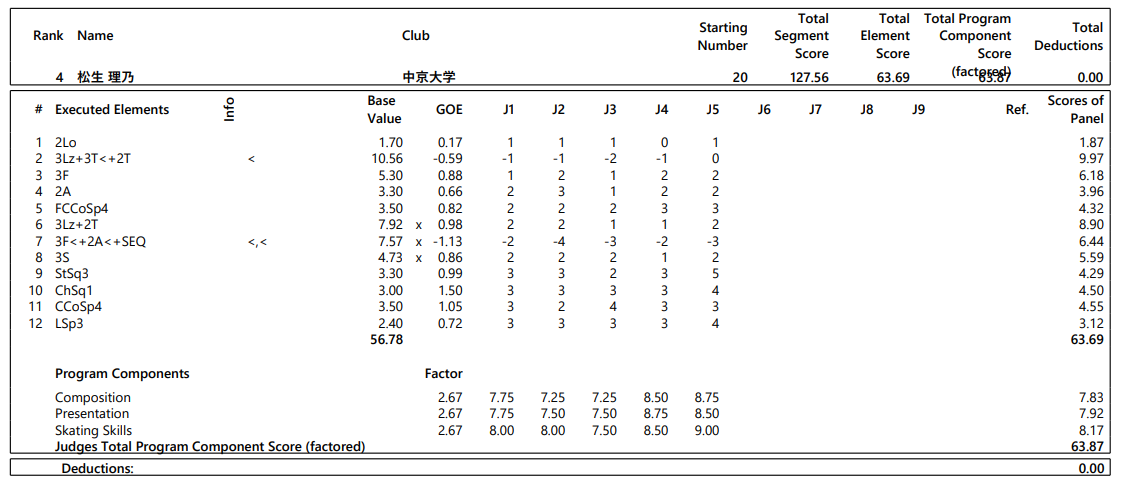 日本学生氷上競技選手権は11日、東京辰巳アイスアリーナでフィギュアスケート最終日が行われ、女子でショートプログラム(SP)5位の松生理乃(中京大)はフリー4位の合計187.32点で4位だった。