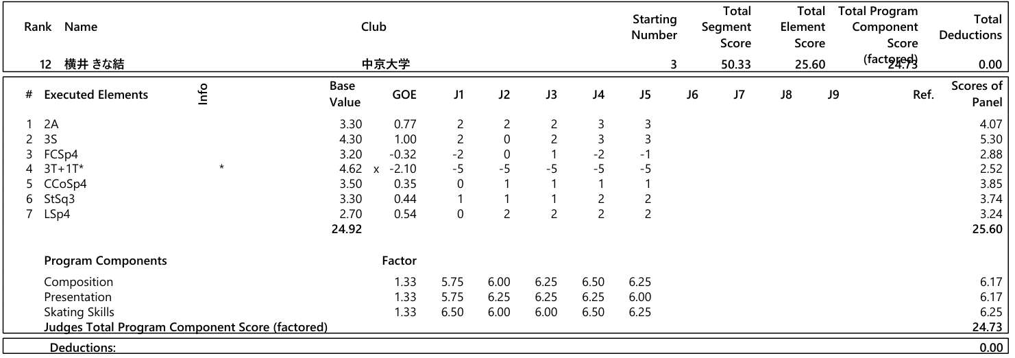 コメント全文 横井きな結、目標だった同期と4人でのインカレは一番の思い出に 【日本学生氷上競技選手権・女子SP】 日本学生氷上競技選手権横井 きな結 日本学生氷上競技選手権 横井きな結 SNSでシェア 日本学生氷上競技選手権は10日、東京辰巳アイスアリーナでフィギュアスケート第1日が行われ、女子ショートプログラム(SP)で横井きな結(中京大)は50.33点で12位となった。 横井の演技詳細とコメント全文は次の通り。 facebook X(旧Twitter) LINE URLをコピー いいね この記事を書いた人 品川 絵里 (しながわ・えり) 2018年に入社し、大分支局を経て20年から東京、大阪、名古屋でスポーツを取材。現在はプロ野球中日、フィギュアスケートなどを担当している。中高は創作ダンス部で、趣味は宝塚歌劇やミュージカル、中韓ドラマの鑑賞。 この記者のページへ進む 前の記事 あわせて読みたい 中村俊介、名コーチ?三浦佳生のアドバイスが「良かった」 快く不在のポジションを「やっちゃうよ!」【日本学生氷上競技選手権・男子フリー】 コメント全文 NEW 2026.01.14 中村俊介、同じ年の五輪代表三浦佳生から刺激 ひたむきな千葉百音は「練習から尊敬するスケーター」【日本学生氷上競技選手権・男子SP】 コメント全文 NEW 2026.01.14 三原庸汰、地元石川のリンク使えず「新潟行ったり、福井行ったり」 憧れ羽生結弦さんが開催したスケート教室手伝い「頑張らないと」【日本学生氷上競技選手権・男子SP】 コメント全文 2026.01.13 松生理乃、来季は卒業という区切りの年になるので自分の集大成 「引退するにしてもしないにしてもやり切ったなって思える年に」【日本学生氷上競技選手権・女子フリー】 コメント全文 2026.01.13 今季終了の河辺愛菜、鍵山先生の指導で跳び方が固まった 「まだ、4年後目指すか決めていない。まず次のシーズン」【日本学生氷上競技選手権・女子フリー】 コメント全文 2026.01.13 住吉りをん「このまま続けても同じ結果になるのでチャレンジ」 4年後へ神宮の拠点は変えず、トレーニングなど根本から改革へ 【日本学生氷上競技選手権・女子フリー】 コメント全文 2026.01.12 ピックアップ 「ワンピース・オン・アイス」は好きな漫画「絶対やります」と即答 アイスショーはお客さんがメイン、純粋に楽しんでもらうもの【第3回・宮本賢二 表現の設計図】 連載 2026.01.06 全日本でやり切れたことがめちゃめちゃうれしかった 現役引退後にやりたいことは…【第5回 新葉のことば】 連載 2026.01.02 【独自】キャシー・リード・コーチ、「エレガント」ないくこうが目指すのはパパシゼ 元オリンピック日本代表が考える現在の夢とは… インタビュー 2025.12.18 金候補りくりゅう、評価される証しで運命コントロールできる オリンピックシーズン、完成形へ追い求める1%ずつの成長 【名将ブルーノの目・第5回GPファイナル(下)】 連載 2025.12.17 【独自】いくこう初の国際大会終え、チームの理想像など思い語る 視線は2030年オリンピック、憧れのアイスダンスのカップルは… インタビュー 2025.12.16 夢がかなった先に見えたパリでのファッションショー デザイナーの考えが尊重される海外選手からの依頼 伊藤聡美さんに聞く(下) 連載 2025.12.10 新着 インタビュー コメント全文 連載 写真ギャラリー 選手名鑑 大会特集 大会日程 アイスショー Podcast 動画 イベント 選手支援 このサイトでは、利用状況の把握などのために、Cookieなどを使用してアクセスデータを取得・利用しています。 これ以降ページを遷移した場合、Cookieなどの設定や使用に同意したことになります。 オプトアウトについては、当サイトのサイトポリシーをご覧下さい。
