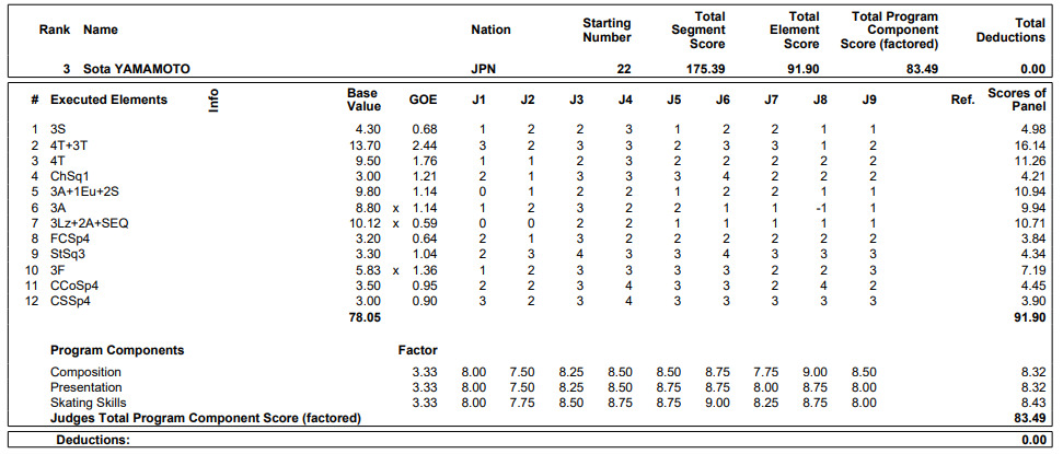 フィギュアスケートの四大陸選手権最終日は25日、北京で行われ、男子でショートプログラム(SP)3位の山本草太(MIXI)はフリーも3位の合計270.07点で初の表彰台となる3位に入った。