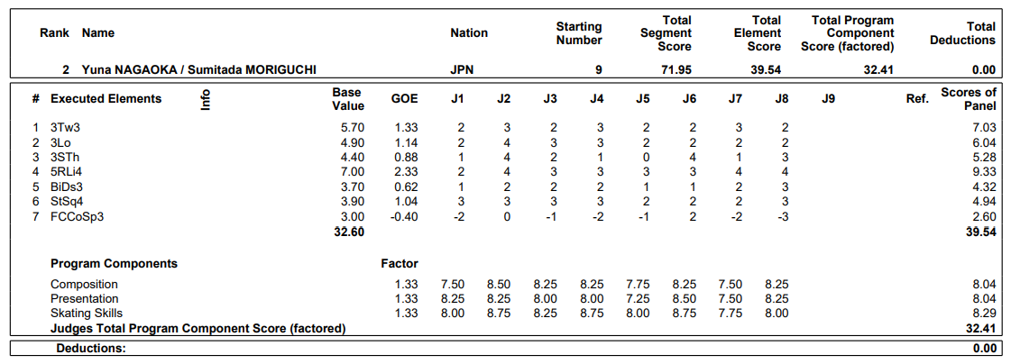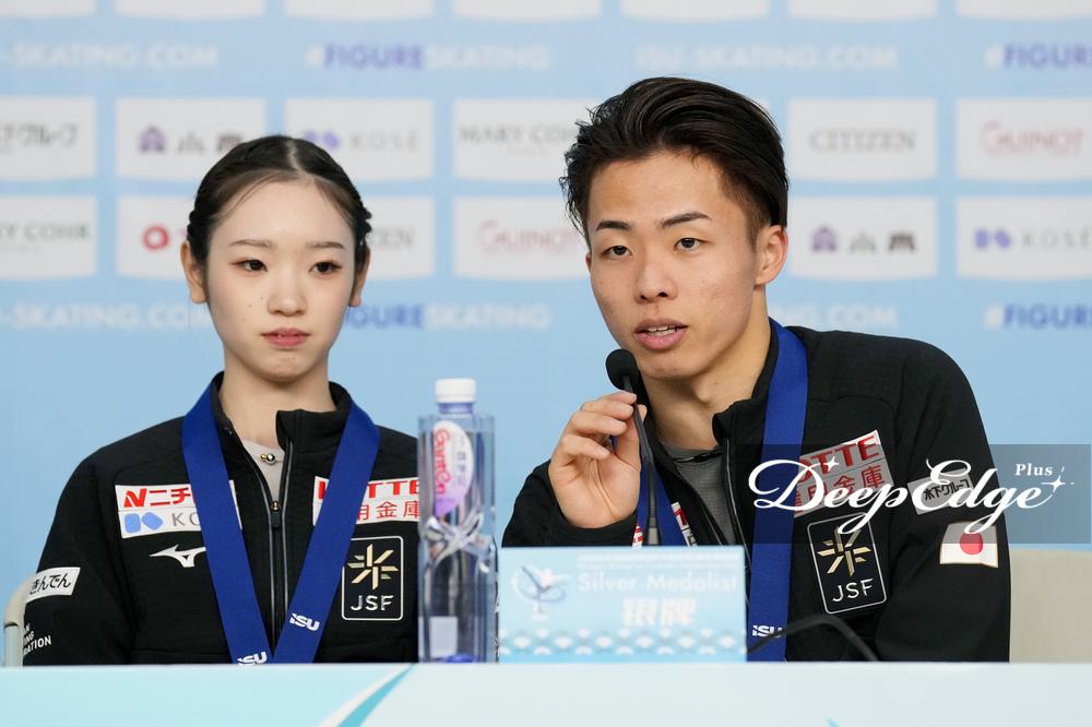 森口「以前ここに来たのは9月のオリンピック予選で来て、すごい緊張感の中で滑った。今回はすごく2人とも落ち着いて滑れた。練習してきたことを発揮できたので、うれしく思います。最後のスピンで僕がミスしたのは悔しい。次のチャレンジはオリンピックになるので、リベンジしたい。自己ベストを更新できて、スモールメダルをいただけて、うれしい気持ちでいっぱいです」