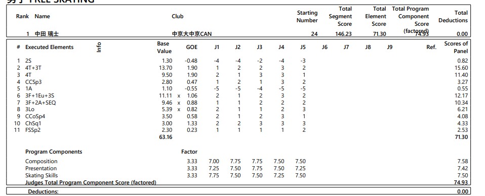 全国高校スケート選手権第4日は25日、宇都宮市スケートセンターなどで行われ、フィギュア男子決勝のフリーは中田璃士(なかた・りお)(愛知・中京大中京)がショートプログラム(SP)に続いてトップの146・23点を出し、合計229・16点で2連覇を果たした。