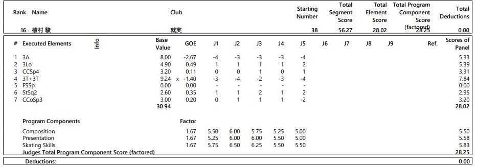 植村のSPの演技詳細とSP後のコメント全文は次の通り。