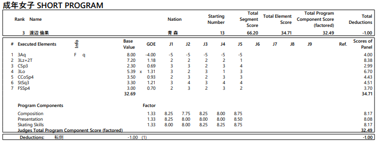国民スポーツ大会冬季大会スケート、アイスホッケー競技会第1日は31日、青森県フラット八戸などで行われ、フィギュアの成年女子ショートプログラム(SP)で地元青森代表の渡辺倫果(三和建装・法大)が66.20点で3位につけた。