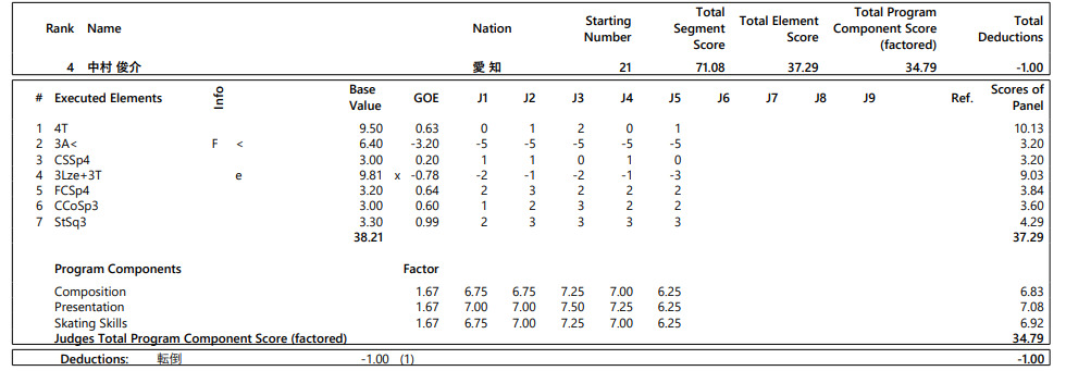 国民スポーツ大会冬季大会スケート、アイスホッケー競技会第1日は31日、青森県フラット八戸などで行われ、フィギュアの成年男子ショートプログラム(SP)で中村俊介(愛知・木下アカデミー)が71.08点で4位につけた。