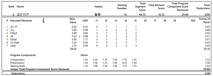 国民スポーツ大会冬季大会スケート、アイスホッケー競技会第1日は31日、青森県フラット八戸などで行われ、フィギュアの成年女子ショートプログラム(SP)で江川マリア(福岡・明大)が64.73点で6位となった。
