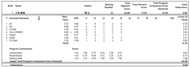 国民スポーツ大会冬季大会スケート、アイスホッケー競技会第1日は31日、青森県フラット八戸などで行われ、フィギュアの成年男子ショートプログラム(SP)で三宅星南(岡山・日本建物管財)が65.80点で7位となった。