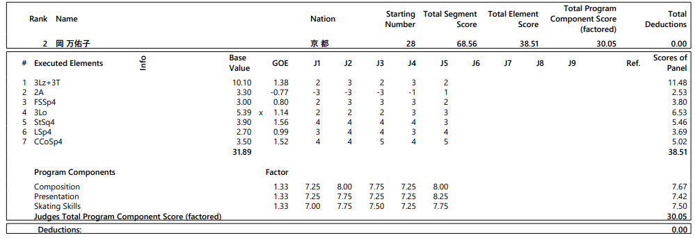 コメント全文 世界ジュニア女王を射程に捉えた岡万佑子「アクセルがしっかりと決まったら、もうちょっと高い得点を狙える」【国民スポーツ大会冬季大会少年女子SP】 国民スポーツ大会冬季大会岡 万佑子 SNSでシェア 国民スポーツ大会冬季大会スケート、アイスホッケー競技会第2日は1日、青森県フラット八戸などで行われ、フィギュアの少年女子ショートプログラム(SP)で岡万佑子(京都・木下アカデミー)が68.56点で2位につけた。 岡の演技詳細とコメント全文は以下の通り。 ―SPを滑り終えての感想を。 「(ダブル)アクセルでステップアウトしてしまったところが悔しい部分でもあるんですけど、落ち着いて、楽しんで滑ることができて良かったです」 ―アクセルは回りすぎてしまった? facebook X(旧Twitter) LINE URLをコピー いいね 次の記事 前の記事 あわせて読みたい 青木祐奈、いつかカズキ君とラ・ラ・ランドのコラボできたら 四大陸のタイトルが重圧に「坂本花織ちゃんは本当にすごい」【国民スポーツ大会冬季大会成年女子フリー】 コメント全文 NEW 2026.02.02 友野一希、入り込んで良い演技ができた「草太にどれだけ食らいつけるかを、自分の中で活を入れながらやっていた」 【国民スポーツ大会冬季大会成年男子フリー】 コメント全文 NEW 2026.02.01 山本草太 、今季最後に感じた楽しさを来季につなげていく「心配させたり、悔しい思いもあったと思うけど、応援ありがとうございました。みんなに伝えたい」【国民スポーツ大会冬季大会成年男子フリー】 コメント全文 NEW 2026.02.01 江川マリア、集大成のトゥーランドットに感極まる「また泣いちゃったな」「この景色を見るの最後だな」【国民スポーツ大会冬季大会成年女子フリー】 コメント全文 NEW 2026.02.01 4回転に挑み続ける住吉りをん「狙いにいってしまった、力んだジャンプになってすごく悔しい」【国民スポーツ大会冬季大会成年女子フリー】 コメント全文 NEW 2026.02.01 三宅咲綺、今季「一つ一つ大切にやりきれた」 上薗さんとは「仲良くて頑張っていけたら【国民スポーツ大会冬季大会成年女子フリー】 コメント全文 NEW 2026.02.01 ピックアップ 「ワンピース・オン・アイス」は好きな漫画「絶対やります」と即答 アイスショーはお客さんがメイン、純粋に楽しんでもらうもの【第3回・宮本賢二 表現の設計図】 連載 2026.01.06 全日本でやり切れたことがめちゃめちゃうれしかった 現役引退後にやりたいことは…【第5回 新葉のことば】 連載 2026.01.02 【独自】キャシー・リード・コーチ、「エレガント」ないくこうが目指すのはパパシゼ 元オリンピック日本代表が考える現在の夢とは… インタビュー 2025.12.18 金候補りくりゅう、評価される証しで運命コントロールできる オリンピックシーズン、完成形へ追い求める1%ずつの成長 【名将ブルーノの目・第5回GPファイナル(下)】 連載 2025.12.17 【独自】いくこう初の国際大会終え、チームの理想像など思い語る 視線は2030年オリンピック、憧れのアイスダンスのカップルは… インタビュー 2025.12.16 夢がかなった先に見えたパリでのファッションショー デザイナーの考えが尊重される海外選手からの依頼 伊藤聡美さんに聞く(下) 連載 2025.12.10 新着 インタビュー コメント全文 連載 写真ギャラリー 選手名鑑 大会特集 大会日程 アイスショー Podcast 動画 イベント 選手支援 このサイトでは、利用状況の把握などのために、Cookieなどを使用してアクセスデータを取得・利用しています。 これ以降ページを遷移した場合、Cookieなどの設定や使用に同意したことになります。 オプトアウトについては、当サイトのサイトポリシーをご覧下さい。