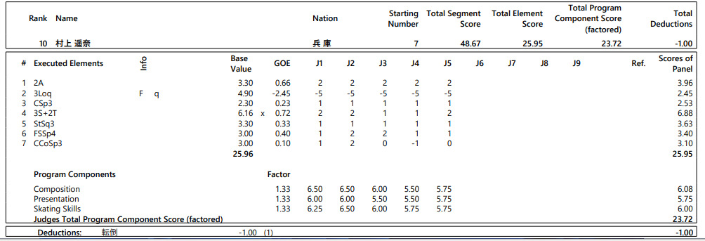 国民スポーツ大会冬季大会スケート、アイスホッケー競技会第2日は1日、青森県フラット八戸などで行われ、フィギュアの少年女子ショートプログラム(SP)で村上遥菜(兵庫・木下アカデミー)が48.67点で10位となった。