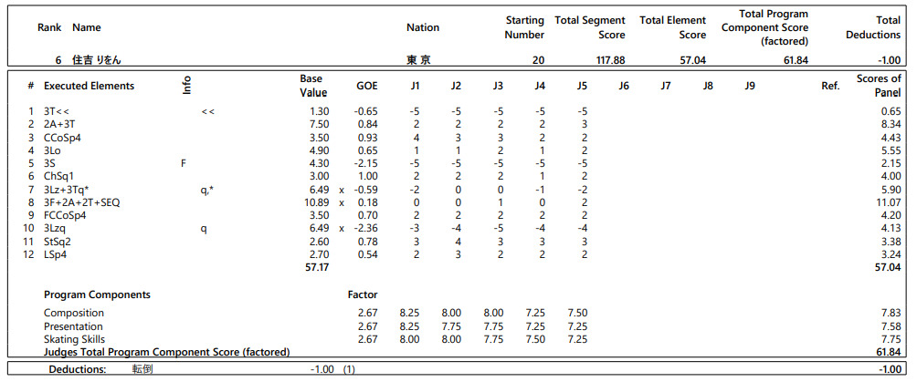 コメント全文 4回転に挑み続ける住吉りをん「狙いにいってしまった、力んだジャンプになってすごく悔しい」【国民スポーツ大会冬季大会成年女子フリー】 住吉 りをん国民スポーツ大会冬季大会 SNSでシェア 国民スポーツ大会冬季大会スケート、アイスホッケー競技会第2日は1日、青森県フラット八戸などで行われ、フィギュアの成年女子でショートプログラム(SP)5位の住吉りをん(東京・オリエンタルバイオ・明大)はフリーは6位となり、合計183.24点で6位だった。 住吉の演技詳細とコメント全文は次の通り。 ―フリーの演技を振り返って 「朝の練習も、今日の6分間練習も、4回転(トーループ)の感触が良かったので、狙いにいってしまったなという感じで…。力んだジャンプになってしまったのがすごく悔しいです」 ―4回転ジャンプの難しさとは? facebook X(旧Twitter) LINE URLをコピー いいね 次の記事 前の記事 あわせて読みたい 青木祐奈、いつかカズキ君とラ・ラ・ランドのコラボできたら 四大陸のタイトルが重圧に「坂本花織ちゃんは本当にすごい」【国民スポーツ大会冬季大会成年女子フリー】 コメント全文 NEW 2026.02.02 友野一希、入り込んで良い演技ができた「草太にどれだけ食らいつけるかを、自分の中で活を入れながらやっていた」 【国民スポーツ大会冬季大会成年男子フリー】 コメント全文 NEW 2026.02.01 山本草太 、今季最後に感じた楽しさを来季につなげていく「心配させたり、悔しい思いもあったと思うけど、応援ありがとうございました。みんなに伝えたい」【国民スポーツ大会冬季大会成年男子フリー】 コメント全文 NEW 2026.02.01 江川マリア、集大成のトゥーランドットに感極まる「また泣いちゃったな」「この景色を見るの最後だな」【国民スポーツ大会冬季大会成年女子フリー】 コメント全文 NEW 2026.02.01 三宅咲綺、今季「一つ一つ大切にやりきれた」 上薗さんとは「仲良くて頑張っていけたら【国民スポーツ大会冬季大会成年女子フリー】 コメント全文 NEW 2026.02.01 地元・青森代表の渡辺倫果「温かくしてくださる県民の皆さまに、温かい演技をお届けできるように」【国民スポーツ大会冬季大会成年女子フリー】 コメント全文 NEW 2026.02.01 ピックアップ 「ワンピース・オン・アイス」は好きな漫画「絶対やります」と即答 アイスショーはお客さんがメイン、純粋に楽しんでもらうもの【第3回・宮本賢二 表現の設計図】 連載 2026.01.06 全日本でやり切れたことがめちゃめちゃうれしかった 現役引退後にやりたいことは…【第5回 新葉のことば】 連載 2026.01.02 【独自】キャシー・リード・コーチ、「エレガント」ないくこうが目指すのはパパシゼ 元オリンピック日本代表が考える現在の夢とは… インタビュー 2025.12.18 金候補りくりゅう、評価される証しで運命コントロールできる オリンピックシーズン、完成形へ追い求める1%ずつの成長 【名将ブルーノの目・第5回GPファイナル(下)】 連載 2025.12.17 【独自】いくこう初の国際大会終え、チームの理想像など思い語る 視線は2030年オリンピック、憧れのアイスダンスのカップルは… インタビュー 2025.12.16 夢がかなった先に見えたパリでのファッションショー デザイナーの考えが尊重される海外選手からの依頼 伊藤聡美さんに聞く(下) 連載 2025.12.10 新着 インタビュー コメント全文 連載 写真ギャラリー 選手名鑑 大会特集 大会日程 アイスショー Podcast 動画 イベント 選手支援 このサイトでは、利用状況の把握などのために、Cookieなどを使用してアクセスデータを取得・利用しています。 これ以降ページを遷移した場合、Cookieなどの設定や使用に同意したことになります。 オプトアウトについては、当サイトのサイトポリシーをご覧下さい。