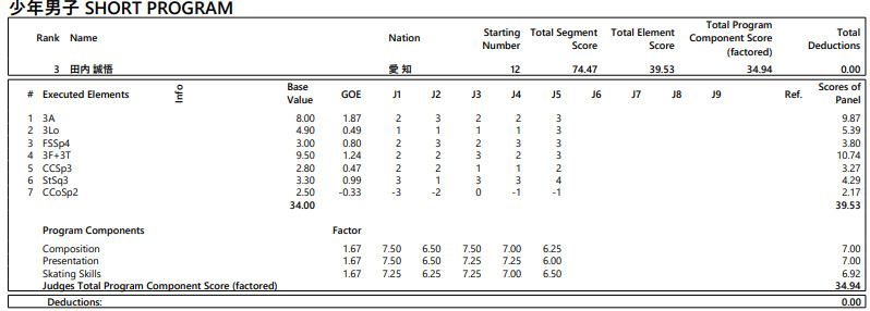 国民スポーツ大会冬季大会スケート、アイスホッケー競技会第3日は2日、青森県フラット八戸などで行われ、フィギュア少年男子のショートプログラム(SP)で田内誠悟(愛知・星槎国際名古屋)が74.47点で3位につけた。