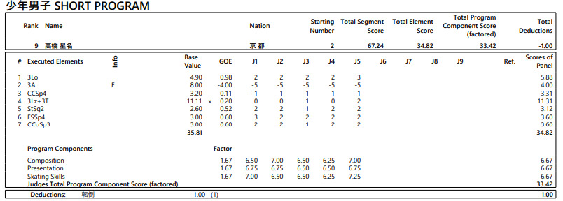 国民スポーツ大会冬季大会スケート、アイスホッケー競技会第3日は2日、青森県フラット八戸などで行われ、フィギュアの少年男子はショートプログラム(SP)で高橋星名(京都・木下アカデミー)が67.24点で9位となった。