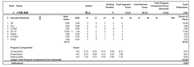 コメント全文 小河原泉颯、アクシデントあったけど集中切らさず 同じ岡山代表の植村駿がいい流れつくってくれた【国民スポーツ大会冬季大会少年男子SP】 国民スポーツ大会冬季大会小河原 泉颯 国民スポーツ大会冬季大会 小河原 泉颯(撮影・宮脇奈月子) SNSでシェア 国民スポーツ大会冬季大会スケート、アイスホッケー競技会第3日は2日、青森県フラット八戸などで行われ、フィギュアの少年男子はショートプログラム(SP)で小河原泉颯(岡山・岡山理大付高)が74.43点で4位につけた。 小河原の演技詳細とコメント全文は次の通り。 「6分間の最後、スピンやっている時に垂れちゃって」 —じゃあもう最初っから。 「はい」 (関係者)「やるしかなかったよね?」 —それであの演技。 「たまたまです」 —素晴らしい演技でした。 「ありがとうございました」 facebook X(旧Twitter) LINE URLをコピー いいね 次の記事 前の記事 あわせて読みたい 高木謡、たくさんの人が応援してくれて気持ちの良い滑りができた「東京チームの皆さんと頑張って、すごく楽しかった」【国民スポーツ大会冬季大会少年女子フリー】 コメント全文 NEW 2026.02.02 吉岡希、兵庫でおすすめスポット「あ、あります。1人でも行きますし-」 来季戦えるように筋力つけて、新しいジャンプも安定して跳べるように【国民スポーツ大会冬季大会成年男子フリー】 コメント全文 NEW 2026.02.02 和田薫子、国スポの和やかな雰囲気を満喫し「都道府県が違っても応援してくれて心強かった、いつもより楽しんで滑れた」【国民スポーツ大会冬季大会少年女子フリー】 コメント全文 NEW 2026.02.02 トリプルアクセルで転倒の岡万佑子「すごい悔しい部分でもあるし、また次につながる収穫でもあると思う」【国民スポーツ大会冬季大会少年女子フリー】 コメント全文 NEW 2026.02.02 次戦は4連覇が懸かる世界ジュニアの島田麻央「失敗しないようにするというより、自分らしさを全開に」【国民スポーツ大会冬季大会少年女子フリー】 コメント全文 NEW 2026.02.02 田内誠悟、自分のやってきたことを全て出しきる「世界ジュニアの代表の3人に食らいついていけるように」【国民スポーツ大会冬季大会少年男子SP】 コメント全文 NEW 2026.02.02 ピックアップ 「ワンピース・オン・アイス」は好きな漫画「絶対やります」と即答 アイスショーはお客さんがメイン、純粋に楽しんでもらうもの【第3回・宮本賢二 表現の設計図】 連載 2026.01.06 全日本でやり切れたことがめちゃめちゃうれしかった 現役引退後にやりたいことは…【第5回 新葉のことば】 連載 2026.01.02 【独自】キャシー・リード・コーチ、「エレガント」ないくこうが目指すのはパパシゼ 元オリンピック日本代表が考える現在の夢とは… インタビュー 2025.12.18 金候補りくりゅう、評価される証しで運命コントロールできる オリンピックシーズン、完成形へ追い求める1%ずつの成長 【名将ブルーノの目・第5回GPファイナル(下)】 連載 2025.12.17 【独自】いくこう初の国際大会終え、チームの理想像など思い語る 視線は2030年オリンピック、憧れのアイスダンスのカップルは… インタビュー 2025.12.16 夢がかなった先に見えたパリでのファッションショー デザイナーの考えが尊重される海外選手からの依頼 伊藤聡美さんに聞く(下) 連載 2025.12.10 新着 インタビュー コメント全文 連載 写真ギャラリー 選手名鑑 大会特集 大会日程 アイスショー Podcast 動画 イベント 選手支援 このサイトでは、利用状況の把握などのために、Cookieなどを使用してアクセスデータを取得・利用しています。 これ以降ページを遷移した場合、Cookieなどの設定や使用に同意したことになります。 オプトアウトについては、当サイトのサイトポリシーをご覧下さい。