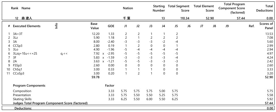 国民スポーツ大会冬季大会スケート、アイスホッケー競技会第4日は3日、青森県フラット八戸で行われ、フィギュア少年男子で東葉の森遼人(千葉)が合計169.92点で13位となった。