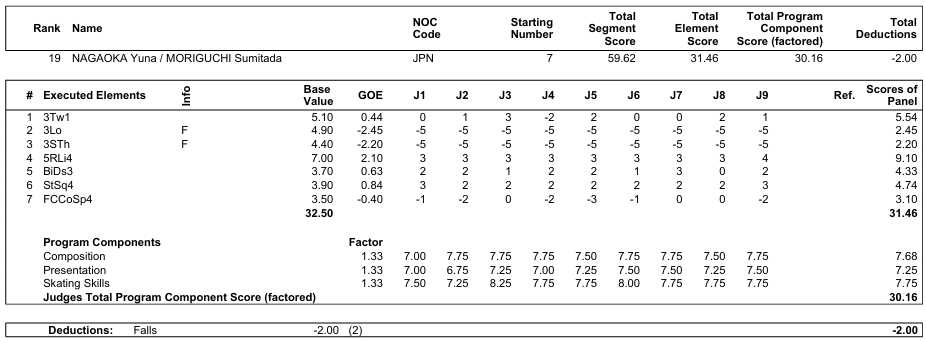 15日のフィギュアスケートのペア・ショートプログラム(SP)で、 初出場の長岡柚奈(ながおか・ゆな)、森口澄士(もりぐち・すみただ)組(木下アカデミー)は59・62点で最下位の19位となり、上位16組による16日のフリー進出を逃した。