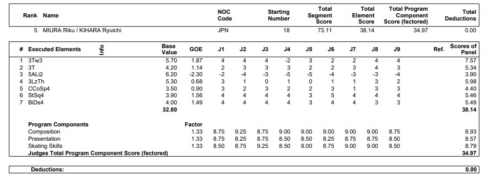 15日のペア・ショートプログラム(SP)で昨季世界選手権覇者の三浦璃来、木原龍一組(木下グループ)はリフトにミスが出て73・11点で5位と出遅れた。