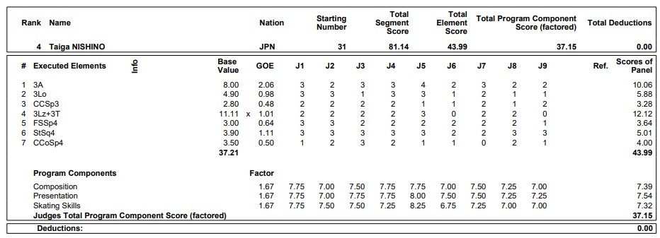 【タリン共同】フィギュアスケートの世界ジュニア選手権は4日、エストニアの首都タリンで開幕し、男子ショートプログラム(SP)で、初出場の西野太翔(神奈川・星槎国際高横浜)は81・14点と自己最高得点を更新し、4位につけた。