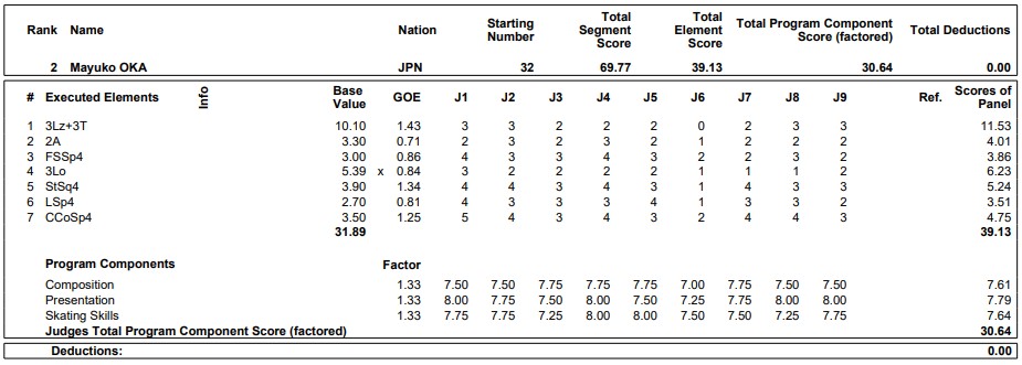 【タリン共同】フィギュアスケートの世界ジュニア選手権第2日は5日、タリンで行われ、女子ショートプログラム(SP)は初出場の岡万佑子(木下アカデミー)が自己ベストの69・77点で2位につけた。