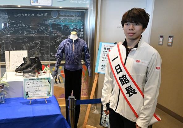 ミラノ・コルティナ冬季オリンピックのフィギュアスケート男子で銅メダルを獲得した佐藤駿が8日、出身地である仙台市の「仙台うみの杜水族館」で、一日館長を務めた。