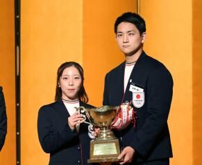 日本スケート連盟は22日、東京都内で2025~26年シーズンの表彰祝賀会を開き、ミラノ・コルティナ冬季五輪のフィギュア・ペアで日本勢初制覇を果たした「りくりゅう」の三浦璃来、木原龍一組(木下グループ)、スピード女子で銅メダル3個を獲得した高木美帆(TOKIOインカラミ)に、最優秀選手に相当するJOC(日本オリンピック委員会)杯を授与した。