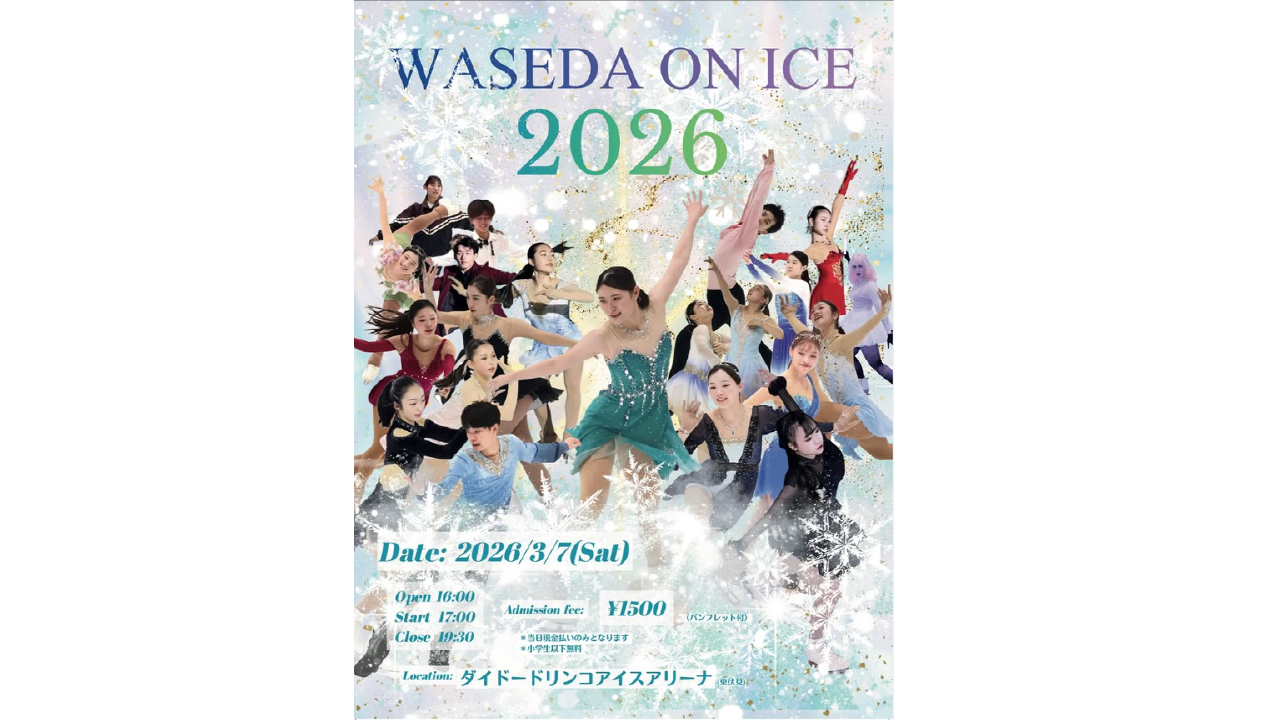 早稲田大学スケート部フィギュア部門は3月7日に、部員によるアイスショー「WASEDA ON ICE 2026」を東京都西東京市のダイドードリンコアイスアリーナで開催する。開催は今年で6回目。一般入場料は1500円(パンフレット付き)で、受付で渡すパンフレットがチケット代わりとなる。決済は現金のみ。小学生以下は無料。