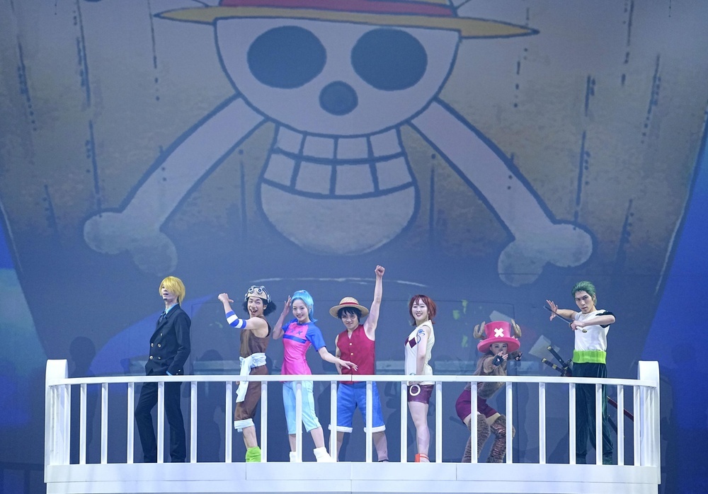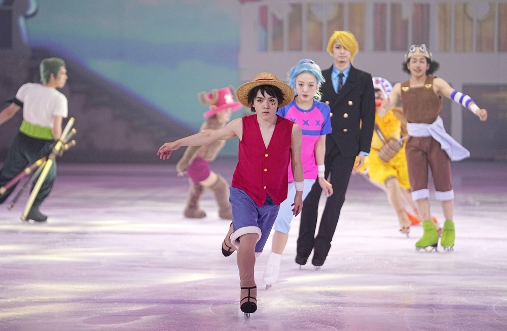 出演者はアニメの声優のセリフに合わせて氷上で演技。プロジェクションマッピングも使って、ファンに人気がある「アラバスタ編」の名場面が表現された。ショーは11~13日に同会場で、9月2、3日に名古屋市のドルフィンズアリーナで開催される。
