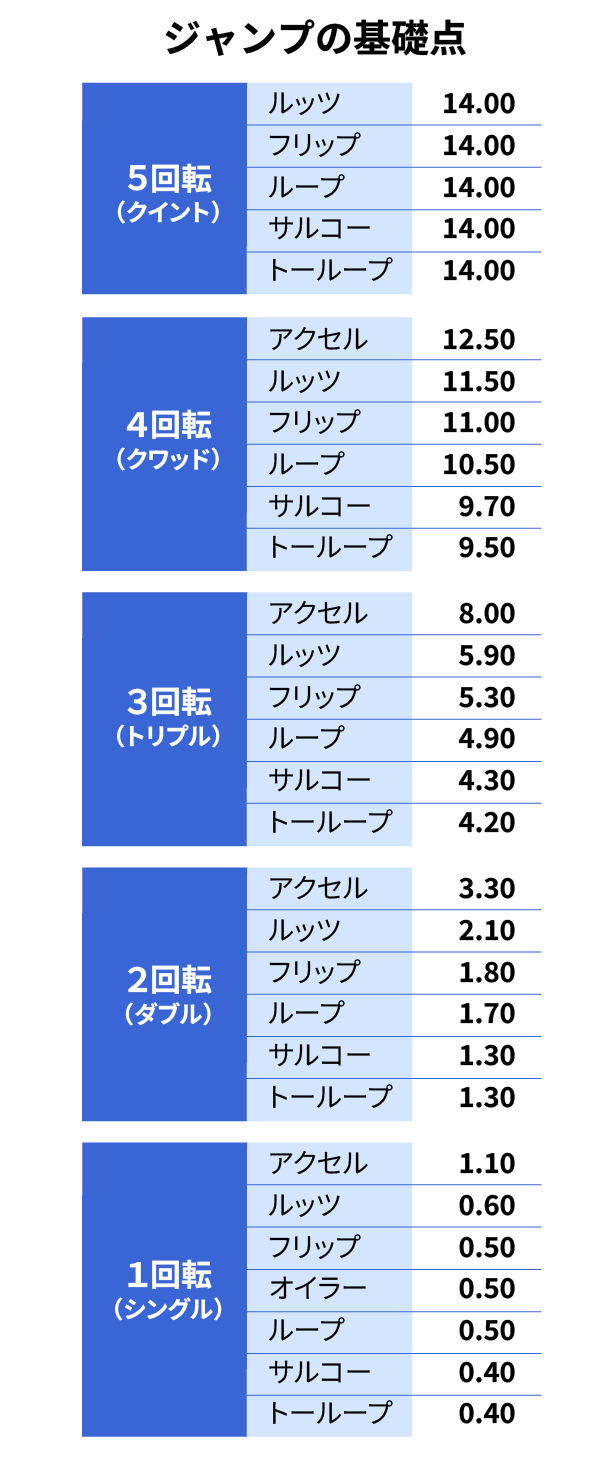 ジャンプはスピンやステップシークエンスと同様に、難易度に合わせて「基礎点」が定められています。基礎点はジャンプの種類と回転数に応じてそれぞれ0.4点(1回転)から14.0点(5回転)まで細かく設定されています。