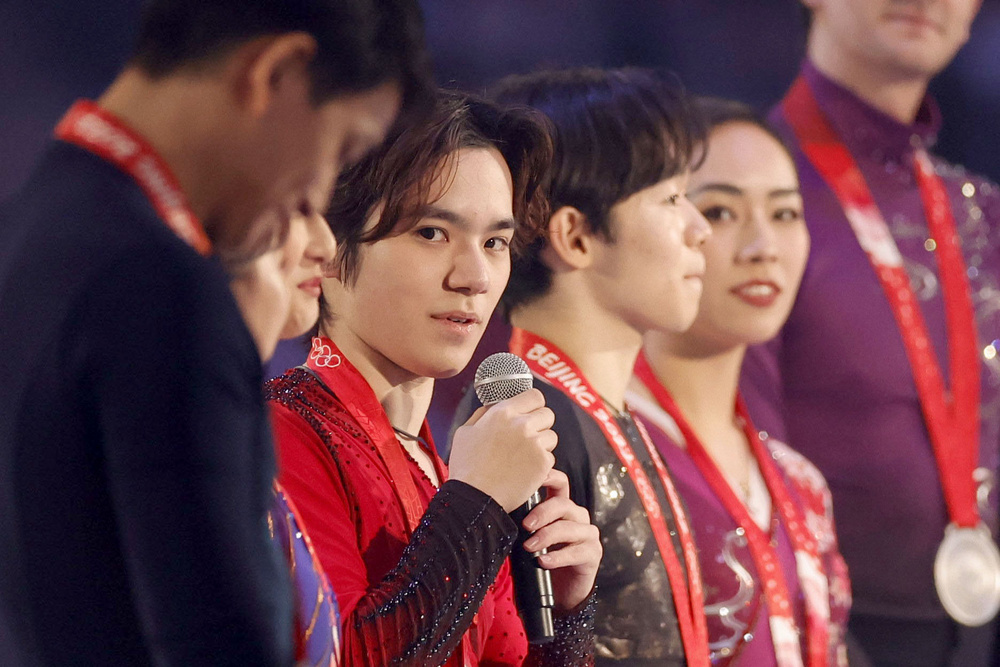 2022年北京冬季オリンピックの団体銀メダルメンバー8人が当時の衣装でエキシビションに登場した。カミラ・ワリエワ(ロシア)のドーピング問題で順位の確定が遅れ、今夏のパリでの授与式は宇野昌磨さんが欠席。3位から繰り上がって初めて全員がそろってファンに報告した。手をつないでの歓喜のジャンプやメダルを披露しての周回に、大きな拍手が送られた。