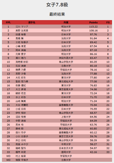 フィギュアスケートのフリーのみで争う東日本学生選手権は12日、東京辰巳アイスアリーナで行われ、女子は江川マリアが115.22点で初制覇し、奥野友莉菜(ともに明大)が108.16点で2位に入った。田邊桜香(日大)が97.76点で3位。
