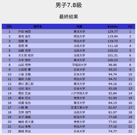 男子は戸田晴登(東洋大)が129.77点で初優勝。菊地竜生が119.94点で2位、周藤集(ともに明大)が119.73点で3位だった。