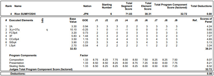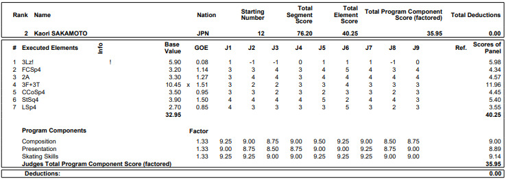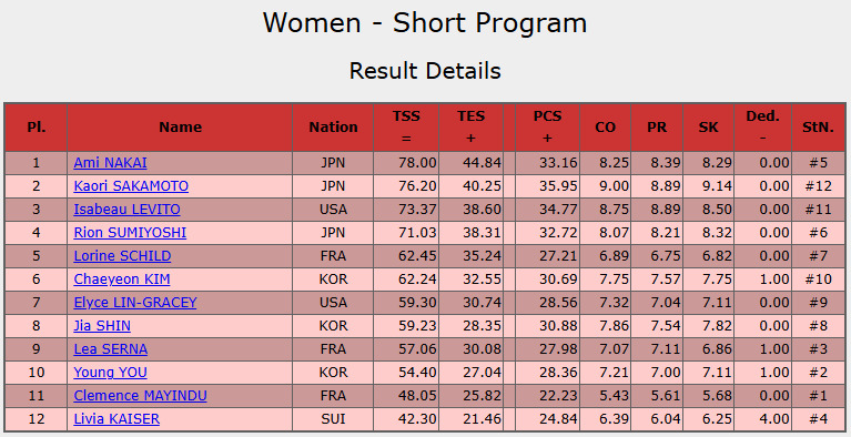 今季限りで引退する前世界女王の坂本花織(シスメックス)が76.20点で2位、住吉りをん(オリエンタルバイオ・明大)は71.03点で4位につけた。3位はイザボー・レビト(米国)。