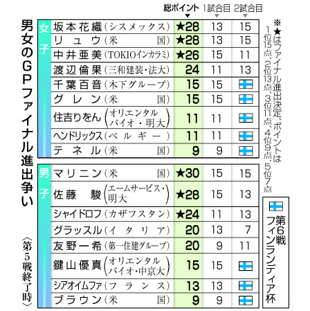 フィギュアスケートのグランプリ(GP)シリーズは21日開幕のフィンランディア杯(ヘルシンキ)が最終第6戦となり、シリーズ総合成績6位までのGPファイナル(12月4~6日・名古屋)進出者が出そろう。注目の男女は既に各3人が確定。ミラノ・コルティナ冬季五輪代表選考でファイナルの日本勢上位2人は優位となるだけに、残り3枚の切符争いが熱を帯びる。