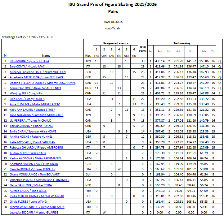 【ヘルシンキ共同】フィギュアスケートのグランプリ(GP)シリーズは22日までのフィンランディア杯でペアの全6戦が終了し、上位6組で争うGPファイナル(12月4~6日・名古屋)に三浦璃来、木原龍一組(木下グループ)が総合ランキング1位で進出することが決まった。唯一のGP2連勝。金メダルに輝いた2022年北京冬季オリンピック後に一度は解散し、今季実戦に復帰した隋文静、韓聡組(中国)は総合7位、GP2戦連続4位の長岡柚奈、森口澄士組(木下アカデミー)は総合11位で進出枠に届かなかった