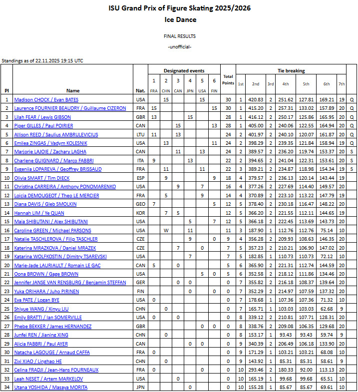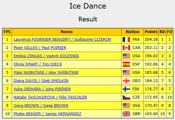 GPシリーズは全6戦を終了し、第2戦と第5戦を制した世界選手権3連覇中のマディソン・チョック、エバン・ベーツ組(米国)が総合1位でファイナルに進出。フルニエボードリー、シゼロン組は総合2位で切符を手にした。