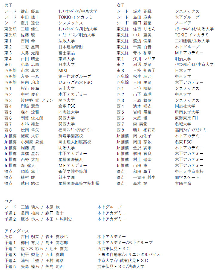 日本スケート連盟は24日、同日まで開催されたフィギュアスケートの全日本ジュニア選手権の結果を受けて全日本選手権(12月19~21日・国立代々木競技場)の推薦選手を発表し、2位に入った女子の岡万佑子(木下アカデミー)や男子の西野太翔(神奈川・星槎国際高横浜)らが名を連ねた。