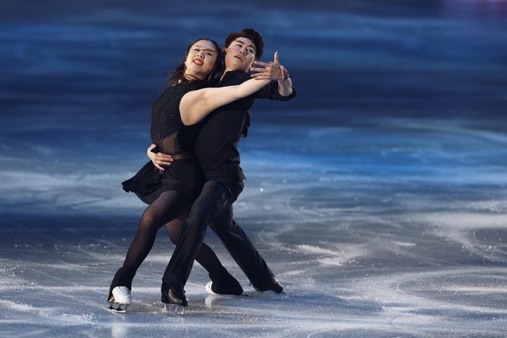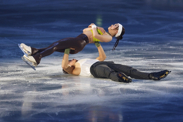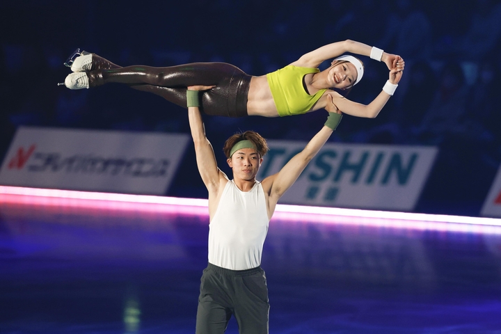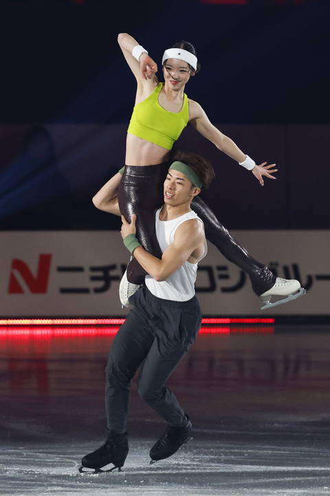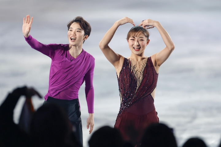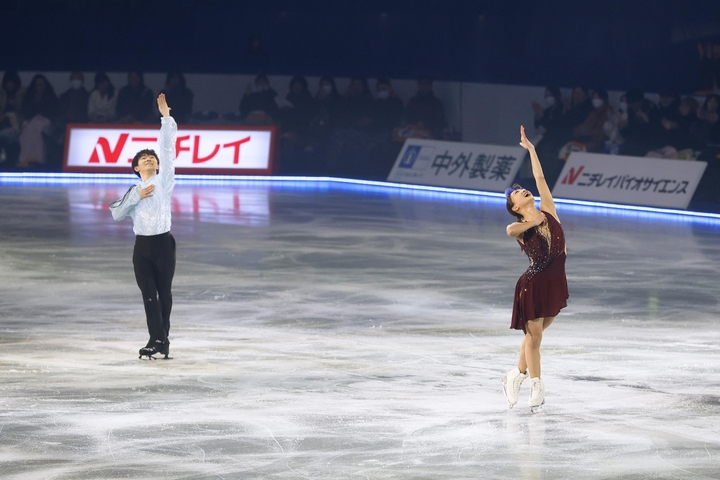 フィギュアスケートの全日本選手権でミラノ・コルティナ冬季五輪代表に決まった選手らが22日、東京・国立代々木競技場でエキシビションに出演した。女子5連覇の坂本花織(さかもと・かおり)(シスメックス)がアンコールでショートプログラムの演目を滑る際に、男子で2連覇した鍵山優真(かぎやま・ゆうま)(オリエンタルバイオ・中京大)が登場。見せ場のステップを一緒に滑って会場を盛り上げた。
