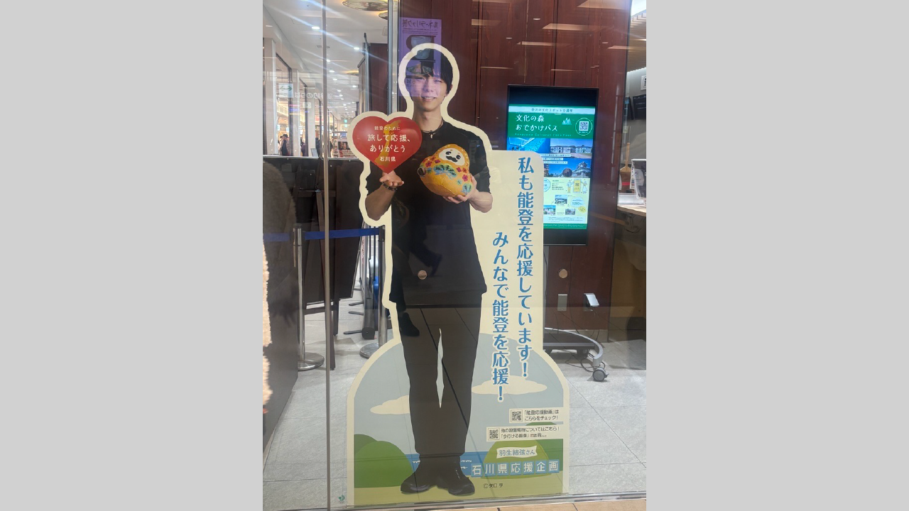 これまで羽生さんの「等身大パネル」や「ポスター」を県内各地の観光施設等で設置してきたほか、現地ではパネル、ポスターに記載されている2次元コードを読み込むことでしか見ることができない「能登応援動画」が視聴できるようになっている。