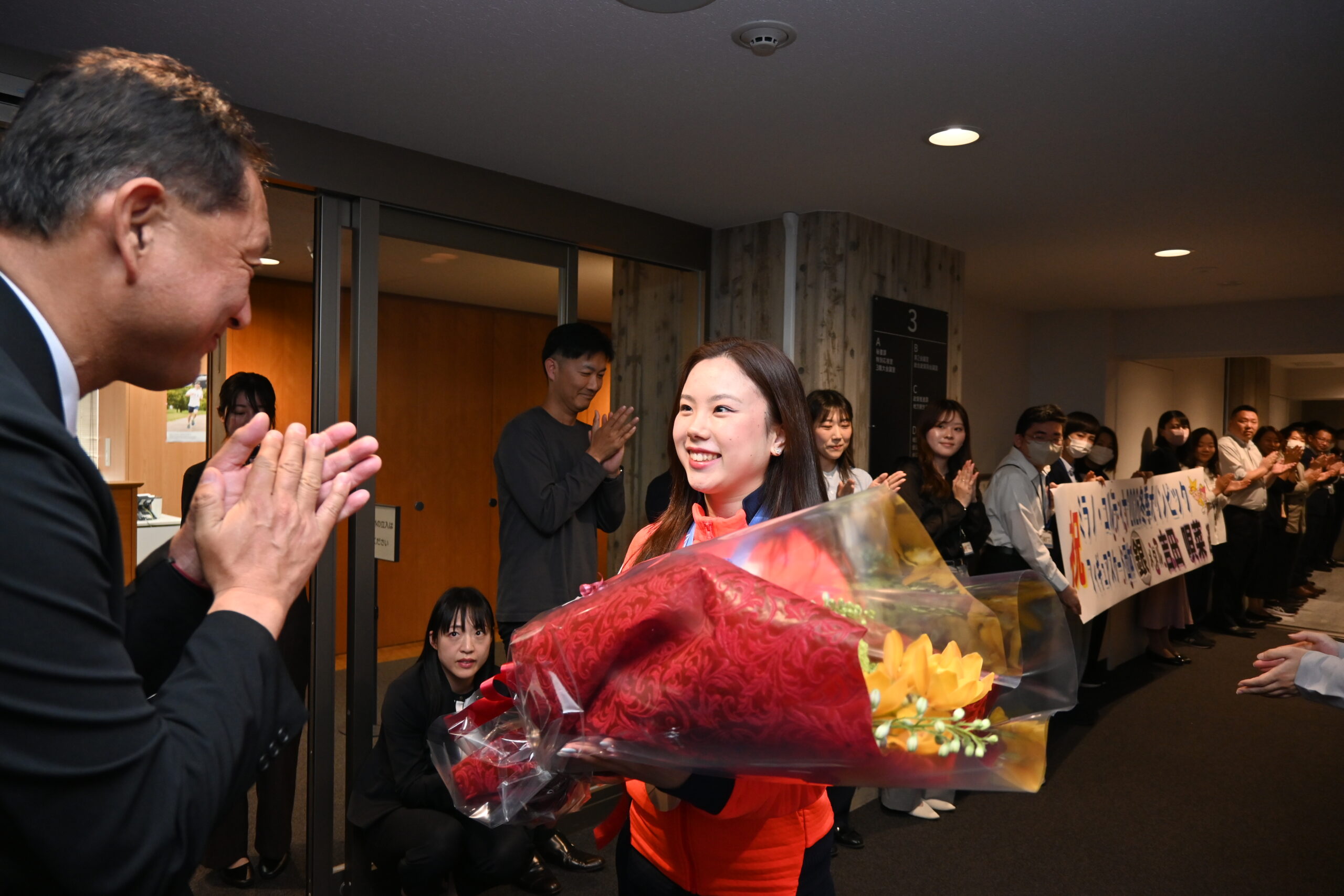 花束贈呈後に行われた授与式で、伊原木知事は「初出場のオリンピックでメダルを取るという素晴らしい活躍でみんな大喜びしている。これからいろいろな活躍をされると期待しています」とたたえた。